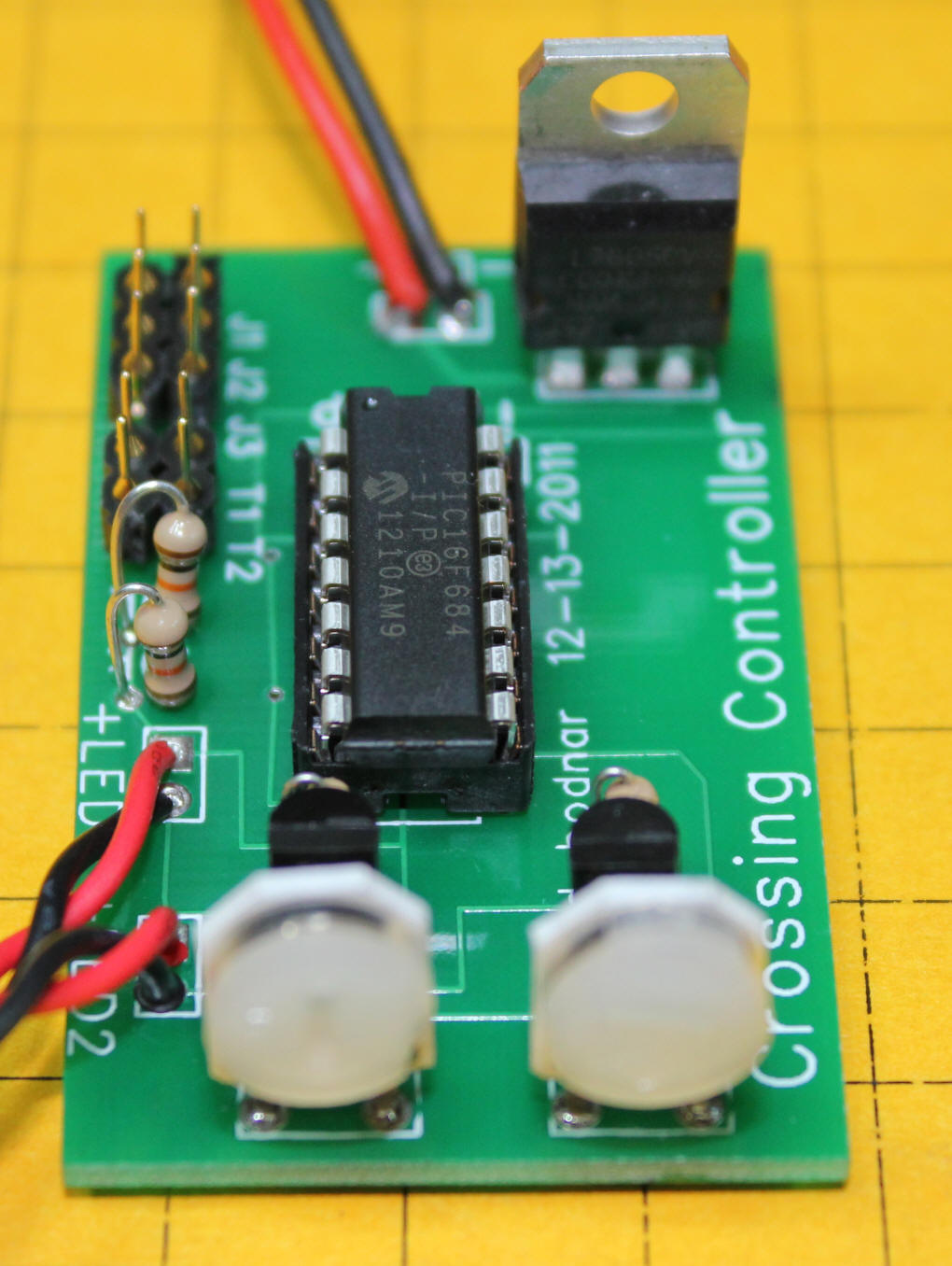 Step #5 This photo shows the three mode selection jumpers installed (bottom left) and the plugs for the two LEDs or incandescent bulbs. If using LEDs the red wire must go to the left as shown. |