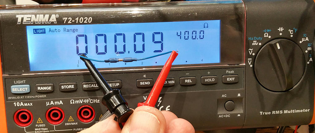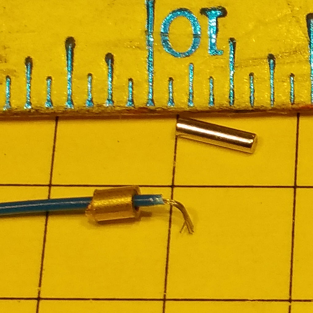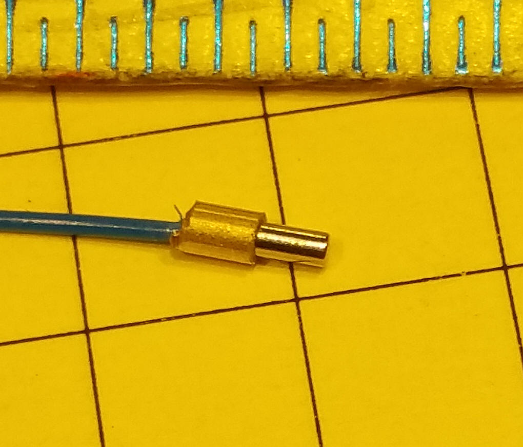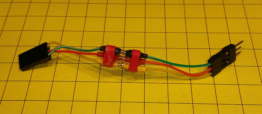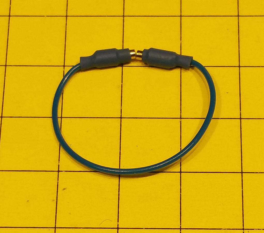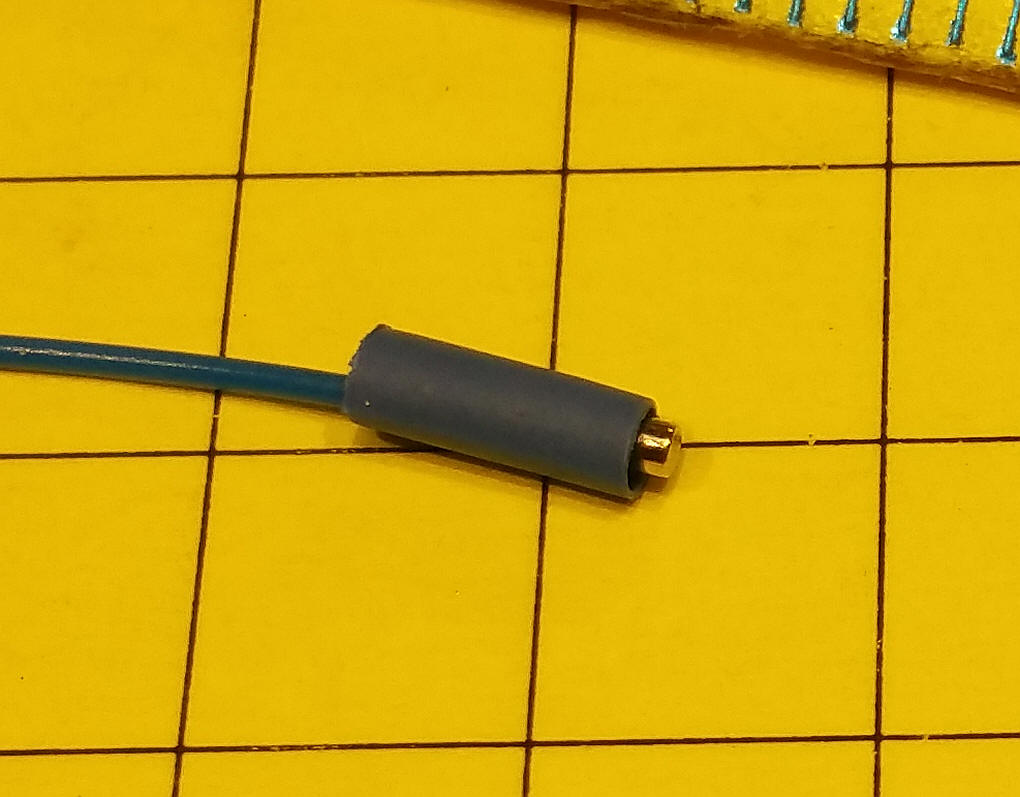 Putting them together Cut a piece of brass tubing about 1/2 the length of the magnet. Put the stripped end of the stranded wire through the brass tubing then press fit the magnet into the tube pinching the wire. Cover most of the end with heat shrink tubing. Remember to make one end the opposite pole from the other so they will stick! Here I joined three conductors to operate a servo. The poles are set so that they will not stick together other than yellow to yellow, red to red and black to black. As you can see the resistance across the joint is very low (0.09 ohms)