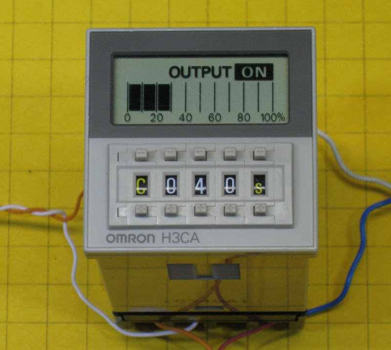 Modification To start a train power is supplied to the track. To stop it track power is removed. This is done by wireing a simple circuit using an Omron H3CA timer. This device is a digital timer that can be configured to activate a relay for a set time (40 seconds in the photo here) when a button is pressed. When the time expires the relay opens.