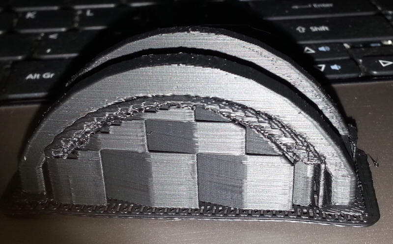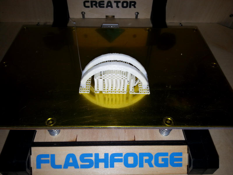 I then reprinted on both printers with the curved part of the bumper up in the air. The prints went well so long as I instructed the printer to use a tight support structure. This photo shows the new printer and its way of supporting the curve of the bumper as it is printed.