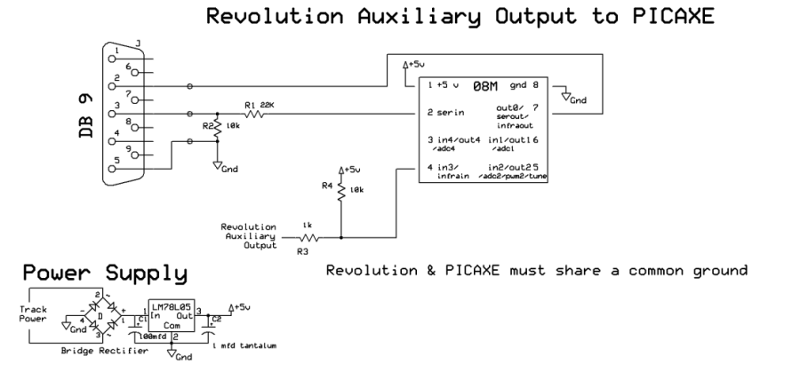 The Revolution's six auxiliary outputs are open collector. They can be interfaced to a PICAXE or PIC microcontroller using the circuit below. The microcontroller and the Revolution receiver must share a common ground. This can be accomplished by connecting the black wire from the auxiliary connector to the ground on the microcontroller. The input pin on the microcontroller must be pulled high with a 10K resistor. The 1K resistor protects the input pin on the microcontroller and is recommended but not absolutely necessary. When the auxiliary output from the Revolution is off the input pin on the microcontroller will be high. When the output is on the pin will be low. The example here uses a PICAXE 08M and input #3 (pin 4). |