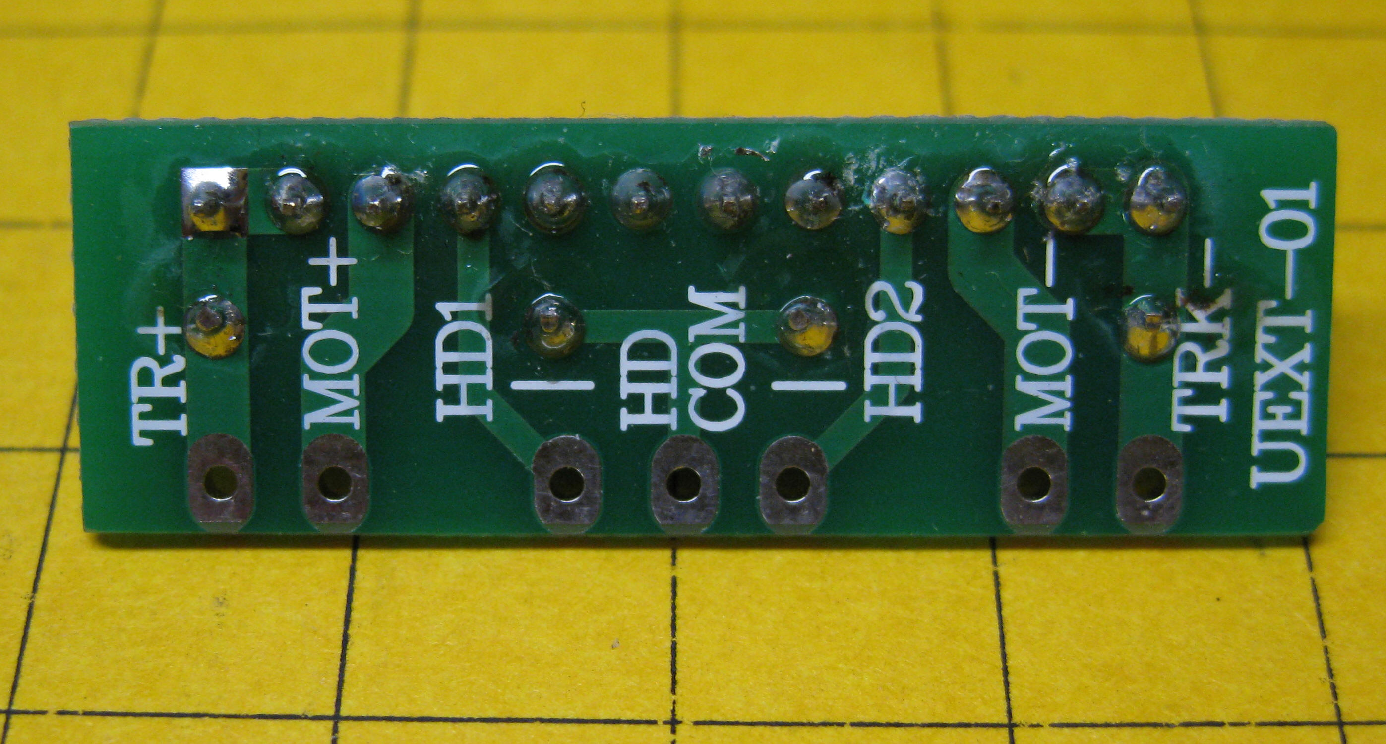 The labels on this view of the adapter board show that the track power goes to the two end connections (TR+ and TR-), the motor wires go to the next two connections (MOT+ and MOT-). The three center connections are for the head and tail lights.