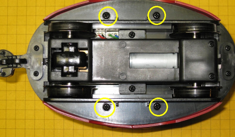 The Revolution receiver can operate front and rear lights so that the headlight comes on when the locomotive is going one way and the taillight comes on when it goes the other. The factory wiring has all six lights connected together in parallel. We need to isolate the wires for the front and rear lights while leaving the four side lights connected together.