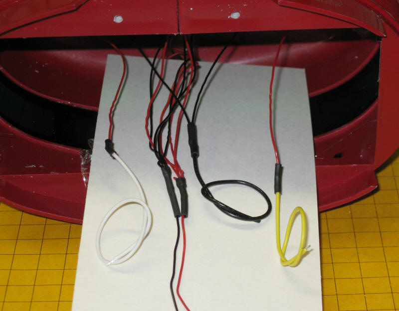Here are all of connections that need to be made. The four pairs of red and black wires in the center go to the four lights on the Eggliner's sides. They will connect directly to the track power so that they remain on at full brightness at all times.