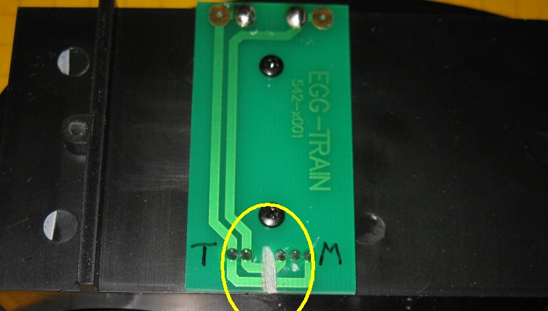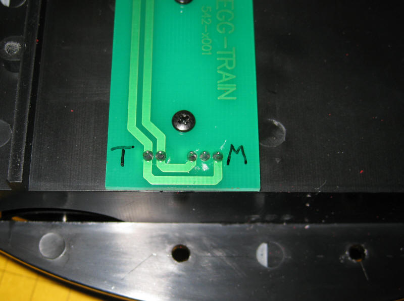 In this close-up of the circuit board the connections to the track (marked "T") and those to the motor (marked "M") are shown. We need to isolate these connections before we connect the Revolution adapter board.