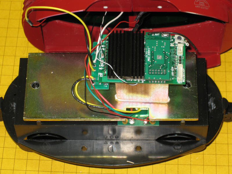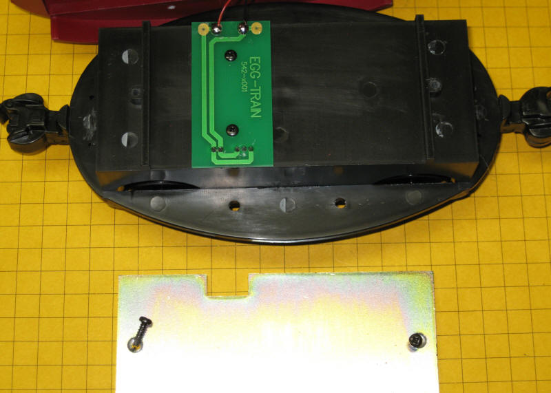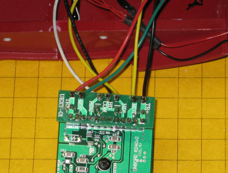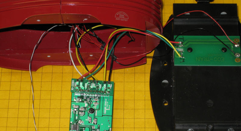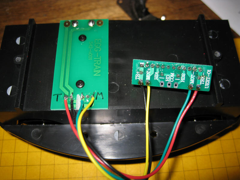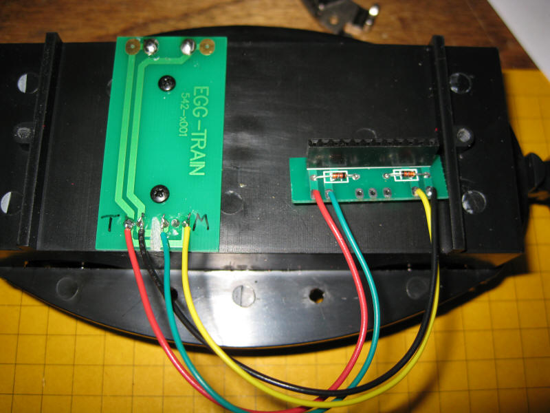 Four six inch long wires are used to connect the Eggliner circuit board to the Revolution receiver's adapter board. Note that the red and black wires connect the track connections and the green and yellow go to the motor contacts.