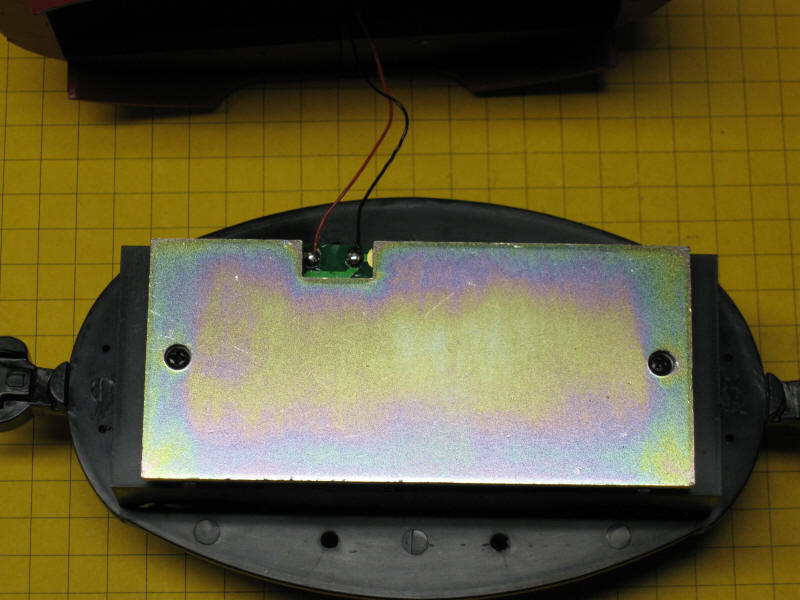 Here you can see the completed installation and the way that the red, black, yellow and green wires have been routed through the notch in the metal weight.