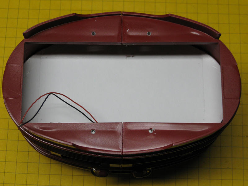 A piece of white cardboard covers the bottom of the Eggliner body. It must be removed to gain access to the lights and to provide room for the Revolution receiver.