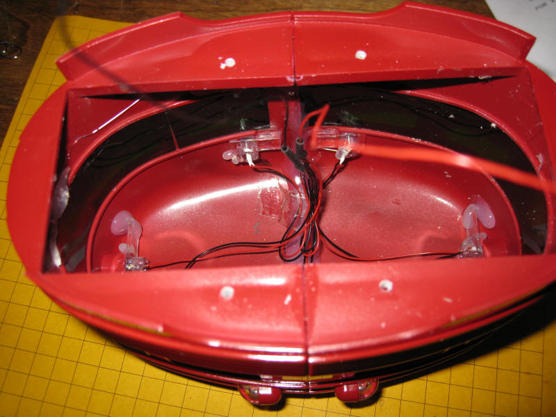 Note: as mentioned above the bulbs are incandescent and draw a good bit of power. For battery operation you may want to replace them with LEDs. This is a somewhat difficult modification as the existing bulbs and lamp fixtures don't come out very easily. It can be done but requires some care. You will also have to pay attention to polarity with LEDs. Make sure that the anodes (positive leads) from the headlight and taillight LEDs are wired together and go to the HD COM connection on the adapter board. The cathodes go to HD1 and HD2. Remember to put a 1K current limiting resistor in series with each LED.