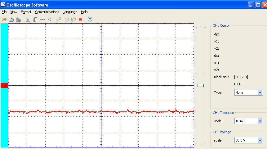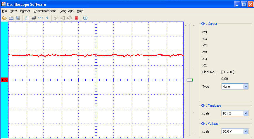 The oscilloscope trace shown below is of the output of the PWC --> Linear converter when the throttle on the Base Station is set to 50% power. You can see that the output is nearly a straight line. What variations there are shown are likely due to noise that is generated by the motor that is being used as a load.