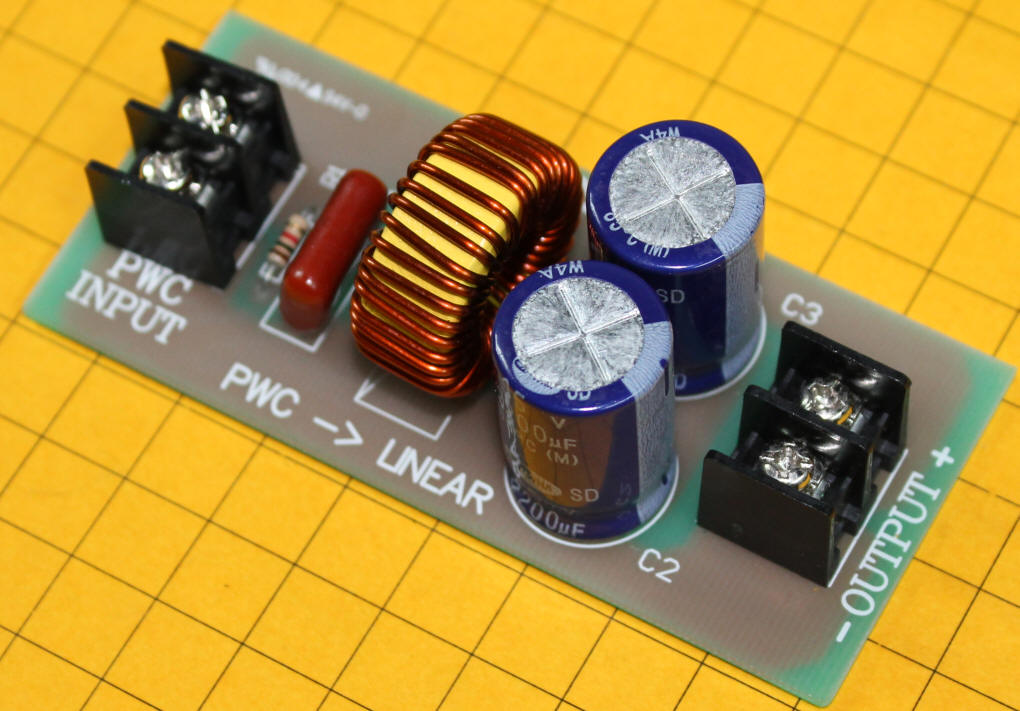 The blue devices with silver tops are capacitors. The large device next to them is a toroidal choke, an inductor, which does most of the work converting PWC to Linear.