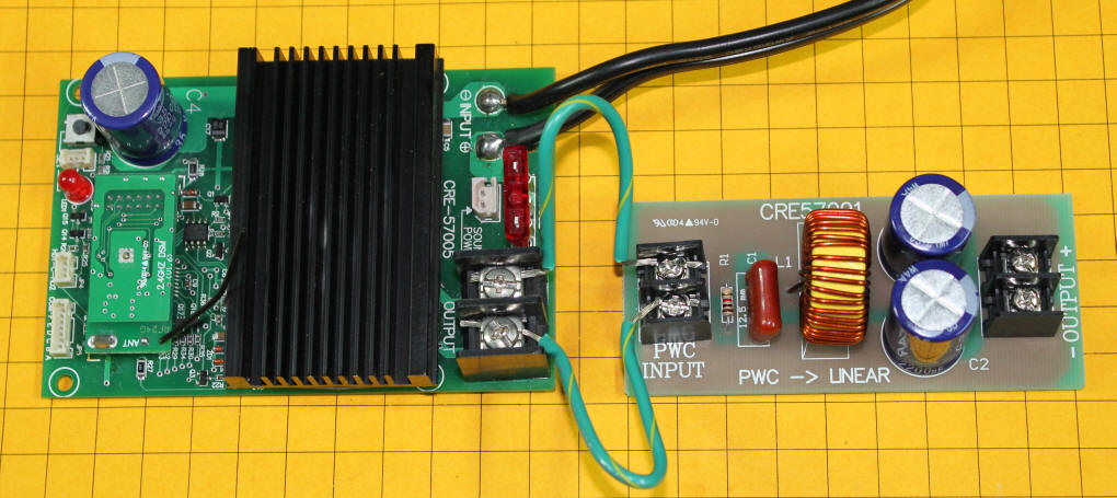 The unit is about 1 3/4" x 3 1/2" x 1 1/8" high. It has two screw terminals on one end that connect to the output from the Revolution Base Station (labeled PWC INPUT) and two screw terminals on the other side that supply linear power. These terminals are labeled "- OUTPUT +" but this is misleading. The polarity of the output is not fixed as the label implies, but follows the polarity of the input voltage. If the Revolution transmitter is set to forward, voltage of one polarity is delivered at the output. If the direction of travel is changed the polarity changes as well.
