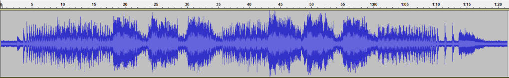 | Sounds and Sound Quality When button #2 is pressed on the steam sound board the bell rings for about 7 seconds. When button #3 is pressed the whistle sounds for about 18 seconds. The whistle does not signal a grade crossing (two longs, a short and a long) but group of three long blasts. I found the sound to be quite acceptable. It is not on the level of high end sound boards but it is very good considering the price and the utility of having it built into the receiver. The bell, whistle and chuff all can be on at the same time. Some inexpensive sound cards shut down one sound when another is called for. Here are some sample sounds from the units. I used two high quality 4 ohm speakers wired in series with baffles on each for the recordings. I did not maintain the same spacing between the speakers and microphone so the variations in loudness shown in the graphs are due variations in my setup. Steam bell only - one button press. Click on the image below to hear the MP3 file or right click, save and play. Steam whistle only - one button press. Click on the image below to hear the MP3 file or right click, save and play. Steam chuff, whistle & bell - click on the image below to hear the MP3 file or right click, save and play. Diesel bell only - one button press. Click on the image below to hear the MP3 file or right click, save and play Diesel whistle only - one button press. Click on the image below to hear the MP3 file or right click, save and play. Diesel prime mover, bell, whistle, speed up, reverse then stop - click on the image below to hear the MP3 file or right click, save and play.