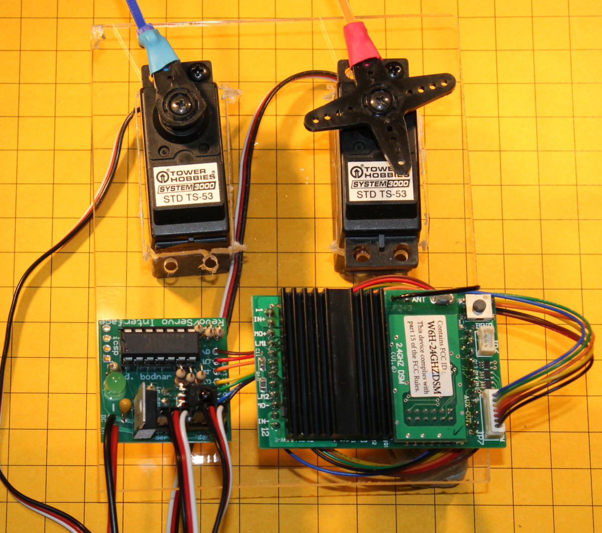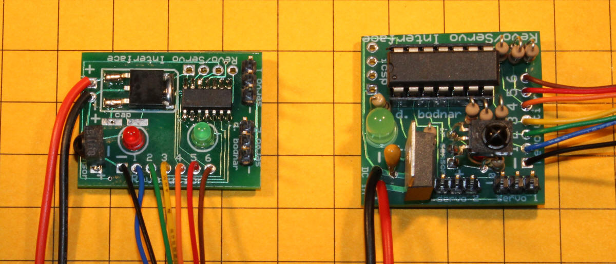 The board, interface cable for the REVOLUTION receiver and two micro servos are shown here. Note that the negative lead on the 3 wire servo cable goes to the left. With these servos that is the brown wire, on other servos the negative lead is black in color. There is a small minus sign next to the negative pin on the circuit board so that you can see where the black (or brown) wire goes.
