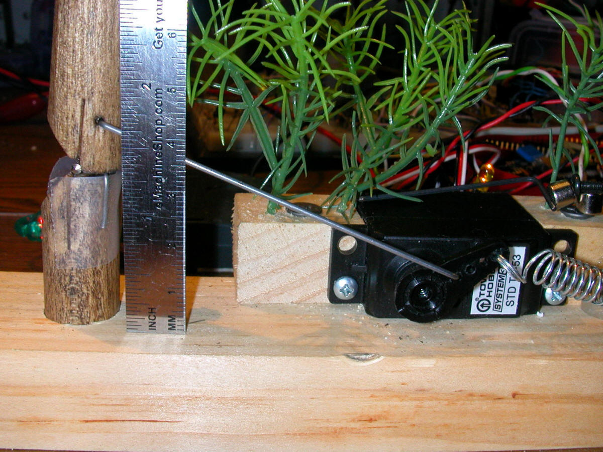 Here is the servo connection to the hinged tree trunk. Note the spring that helps to supply power to put the tree back into a vertical position.