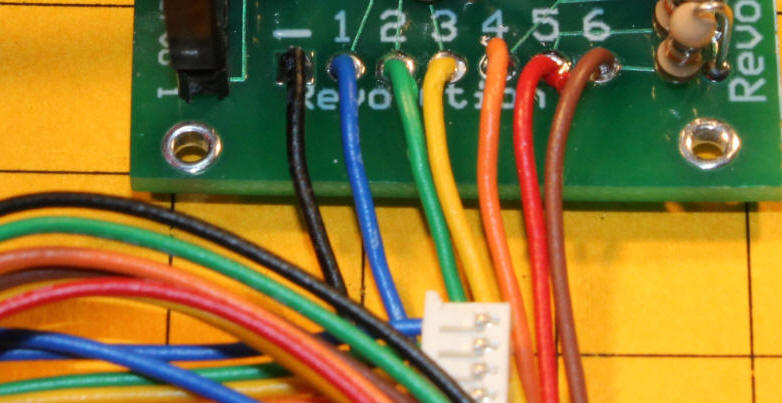 The red and black wires that exit the board in the bottom left go to a source of DC power. This power connection can be to the same battery or other power source that is used by the REVOLUTION receiver. Both the revolution receiver and the servo interface will work with DC voltages between 8 and 24 volts. Lower voltages will allow the system to run cooler. The REVOLUTION receiver is not polarity sensitive but the controller is. Just be sure to observe proper polarity, red to positive (+) and black to negative (-). If you are running from track power where the polarity can change you will need to install a simple bridge rectifier to maintain consistent polarity to the servo board. (Bridge rectifiers are discussed in detail in this article on my web page: http://www.trainelectronics.com/LED_Articles_2007/LED_102/index.htm )
