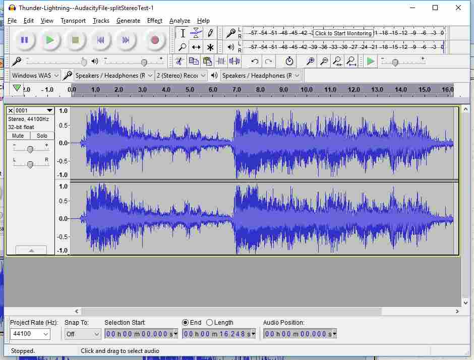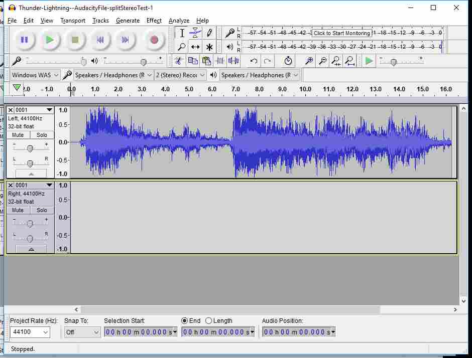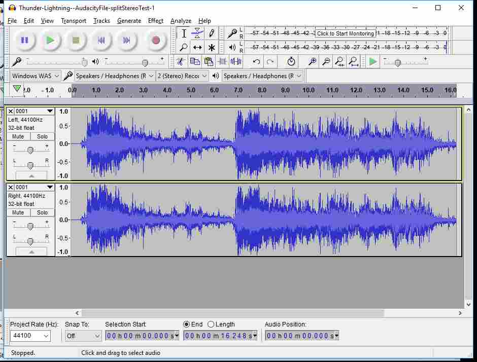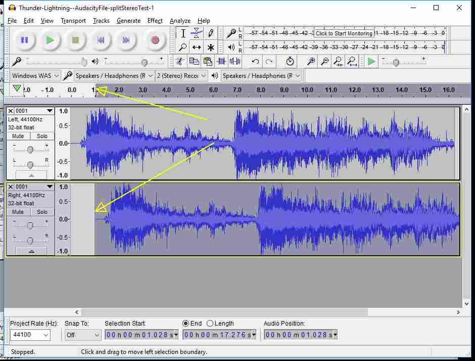How it Works The Arduino that is used doesn't have the memory to do a proper delay within its circuitry. It wasn't until I decided to look beyond the Arduino to the DFPlayer, that has a great deal of memory available, that I came up with a reasonably simple way to implement the desired delay. The DFPlayer has the capability of playing a fully stereophonic sound utilizing separate left and right channel audio. In the original circuit that I made this stereo capability was not needed as the sound worked just fine when played as monophonic. The left and right channels were combined and the output was monophonic and sounded great. To get the delay I reasoned that I could separate the two stereo channels and put the sound file on one and a copy of the sound file, shifted a second or more later in time, on the other channel. The first channel would connect to the Arduino to trigger the bright, white LEDs. The second channel would play the same sound, only a moment later, and it would play through the speaker to represent the delayed sound of thunder. In this image from the sound editor you can see the bottom channel is identical to the top channel but it is shifted a short time, about 3 seconds, to the right so that the sound will play after the first channel triggers the LEDs.
