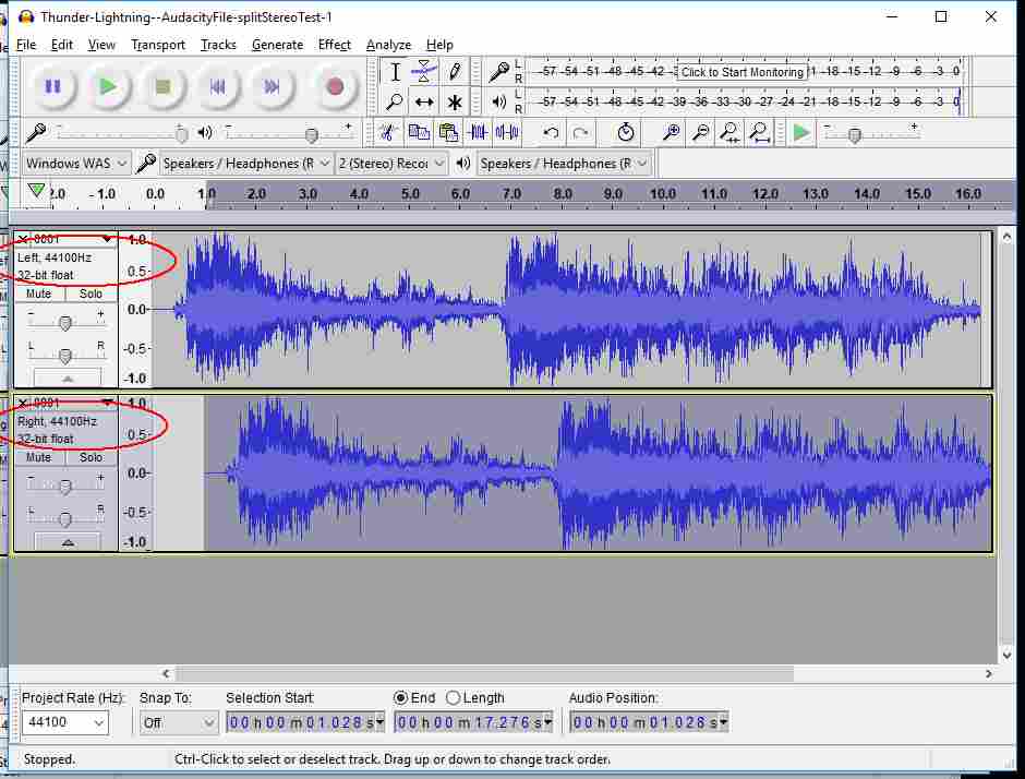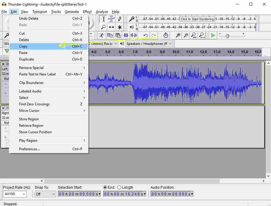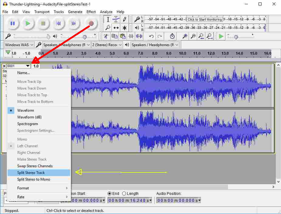 Click the small down pointer (see the red arrow) to bring up the track menu. Click "Split Stereo Track" (see yellow arrow) to create two separate stereo tracks.