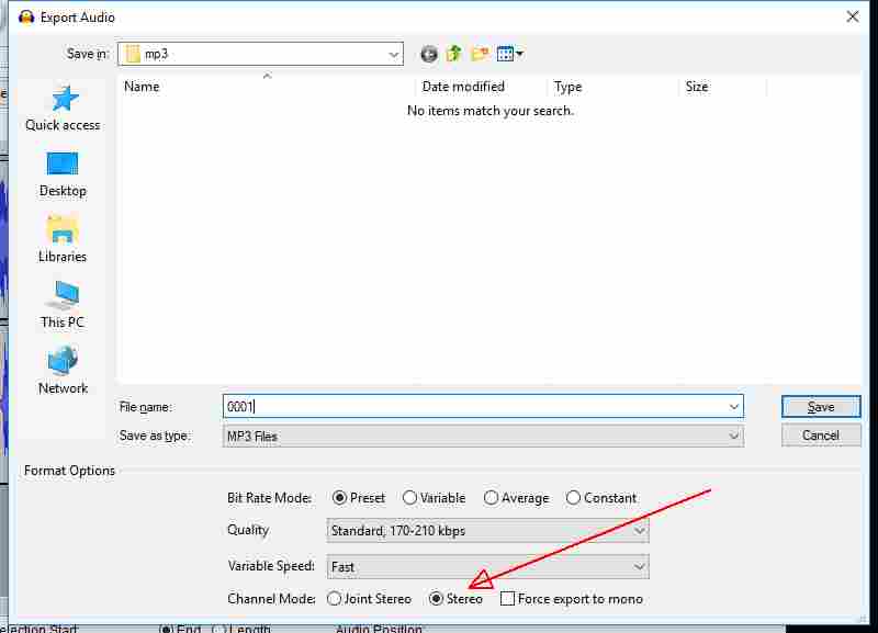 Export the MP3 file by clicking File / Export / Export as MP3. In the dialog box make sure "Stereo" is selected (see red arrow)