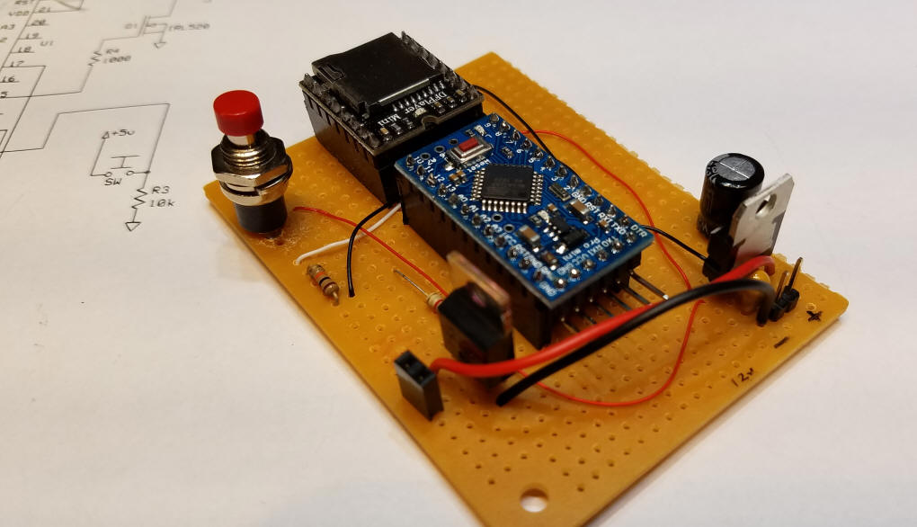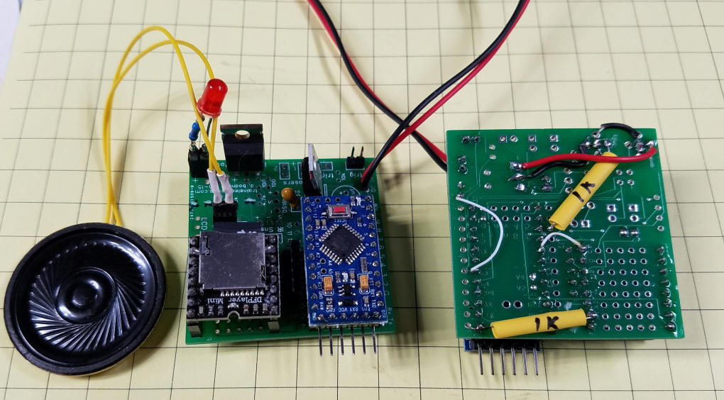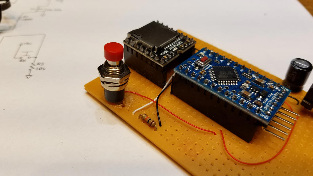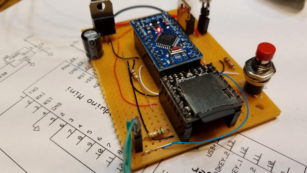 Construction The unit was built on a small piece of prototype board. The solder pad side of the circuit board faces down and the components are inserted from the other side. Step 1 - solder the Arduino and DFPlayer to the board using female header sections. Be careful that there are no solder bridges connecting adjoining pins. Step 2 - power supply The 7805 voltage regulator and the two capacitors are added next - the tantalum capacitor cannot be seen in this photo - it is on the other side of the 7805. Again, be careful of solder bridges! Next add the wires that supply +5 volts (the red wires) and ground (black wires) - the two wires that are not connected will be used for the "start" switch.
