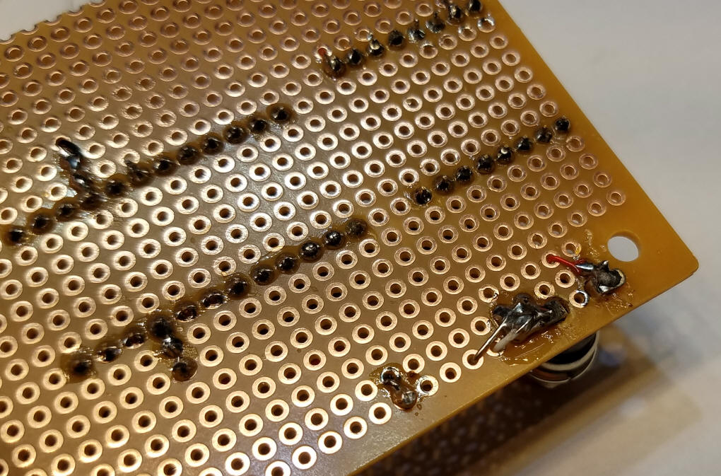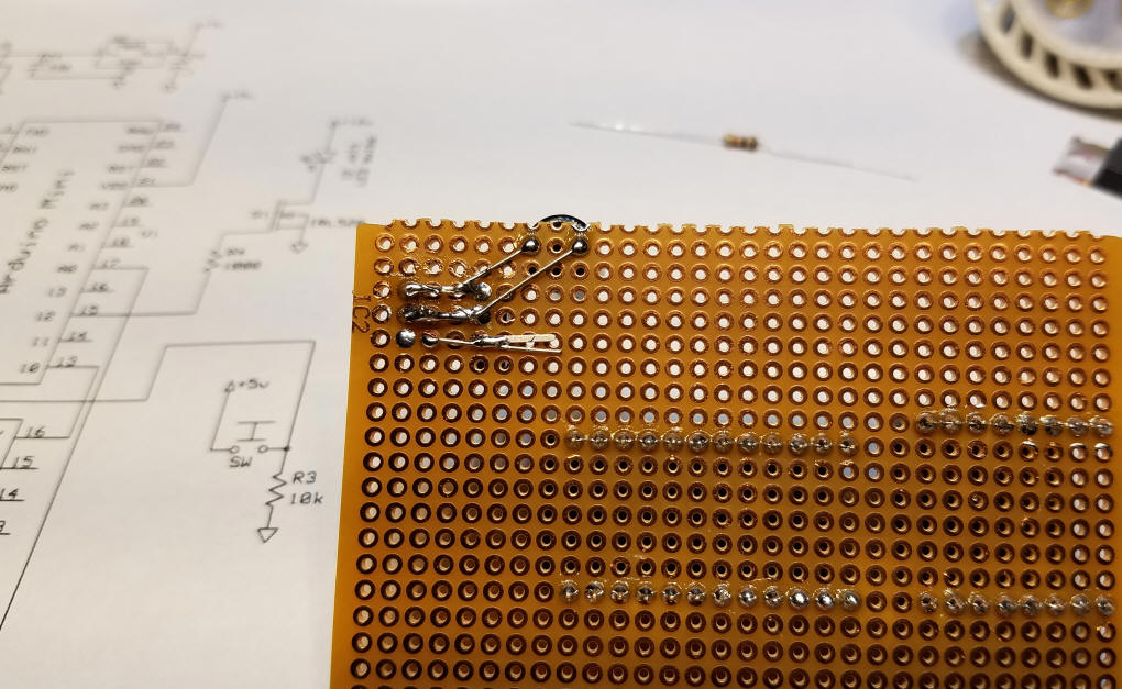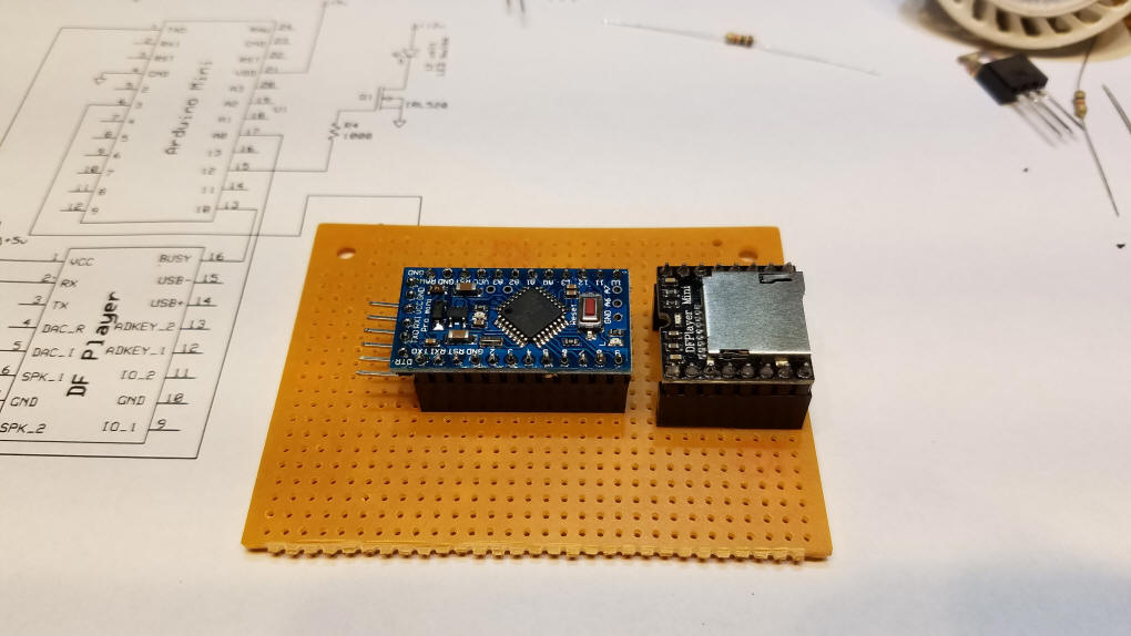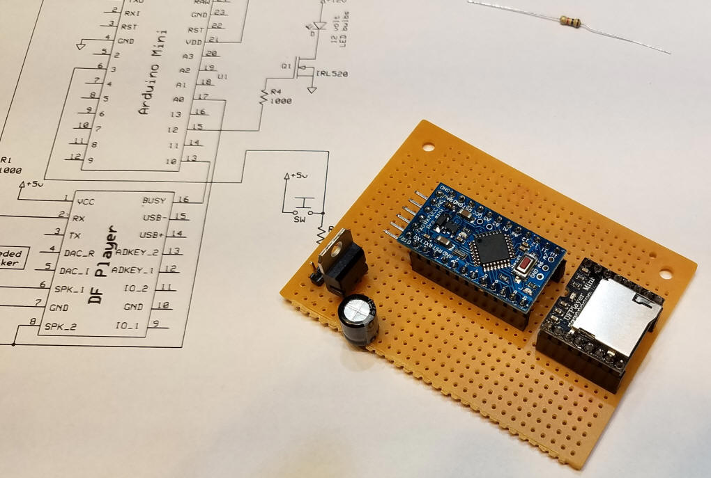 Step 3 - add the "start" switch To accommodate the switch that I used two 1/8" holes were drilled in the board. The 10 K resistor holds the Arduino pin that connects to the switch low until it is pressed. Step 4 - add the light control Mosfet - there is a two pin female header next to it that the LEDs plug into - if you prefer they can be wired directly. The two heavier red and black wires deliver power directly to the Mosfet and the plug for the LED bulbs. Using thinner wire would limit the amount of current available to the LEDs. Step 5 - final connections Don't forget the jumper between Arduino pin 10 & DFPlayer pin 16 and the wire (blue in the photos) that connects speaker pin 8 on the DFPlayer and pin A0 on the Arduino. The 5 ohm resistor between the speaker and pin 6 on the DFPlayer is only needed if you use a 4 ohm speaker - if you don't use the resistor with a 4 ohm speaker the voltage regulator will get quite hot. An 8 ohm speaker works without the resistor. The wires on the top of the board were placed that way to more clearly illustrate the circuit wiring. If you prefer you could put those wires on the bottom of the board. The wiring on the back of the board is minimal.