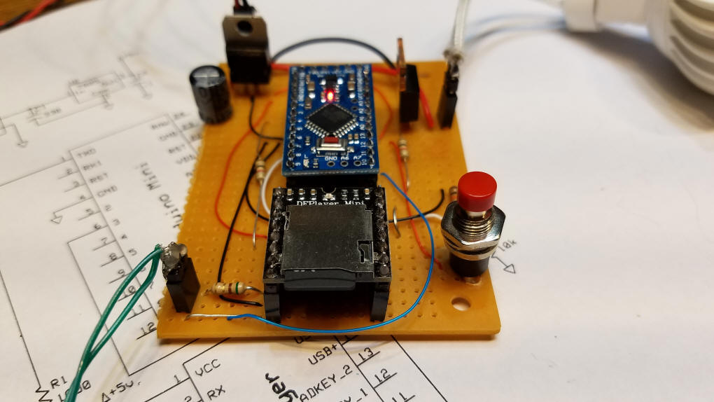 I have a good deal of experience with micro-controller controlled MP3 players including the VMUSIC2 and the DFPlayer. I opted to use the DFPlayer for this project as it works very well with an Arduino and is quite inexpensive. More importantly it is easy to control and can power a speaker without an additional amplifier. This project can be built on a piece of prototype board with point to point wiring. Add a bright LED bulb or three and a speaker to the Arduino and DFPlayer and you are ready to go!
