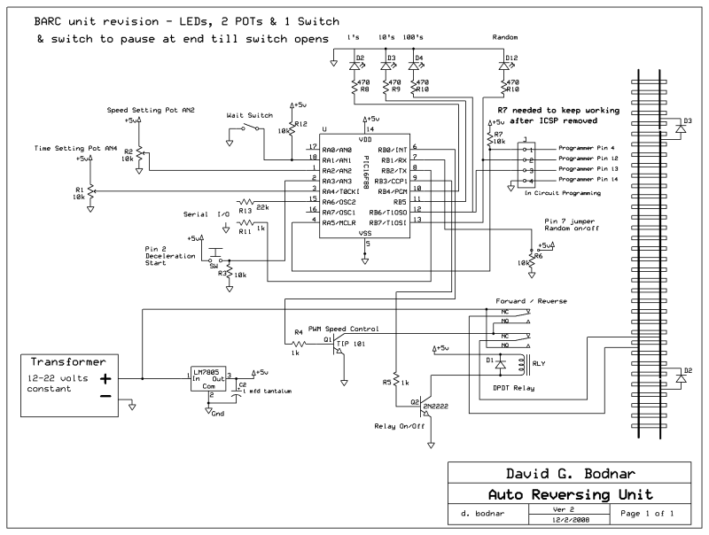 how long it pauses before reversing and returning to its start position. This timer can be triggered by a NO (normally open) reed or push button switch or by an infrared sensor that notes when a train or other object moves near it. The time that the motor runs and the pause time before reversing can be set by adjusting two potentiometers. LEDs show the status of the system and the time remaining before the next motor event. For motors that do not reliably run at the same rate forward and backward there is an option to stop the motor at a specific point with switches. |