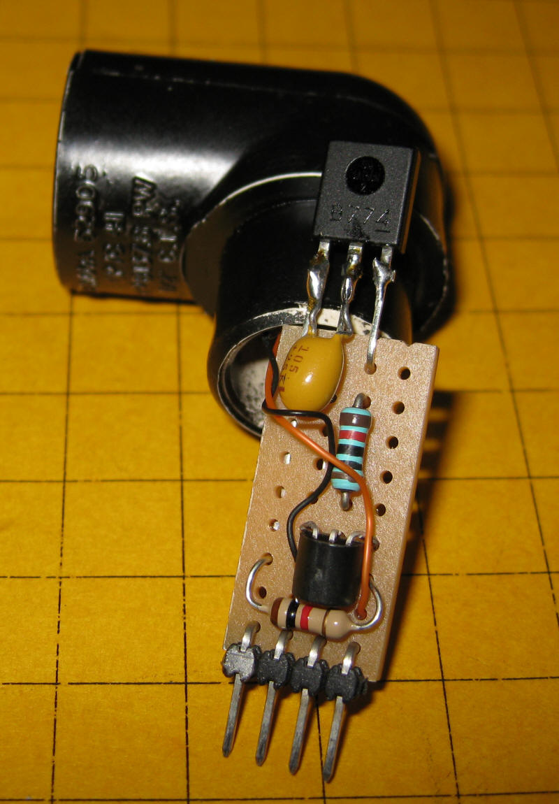 Here is an inside view of the reflective IR sensor. The IR emitter is at the top of the head, beyond view. The IR detector module is marked B774. The circuit board inverts the output from the unit so that the detector shows a low output when no reflection is noted and high when it reflects.