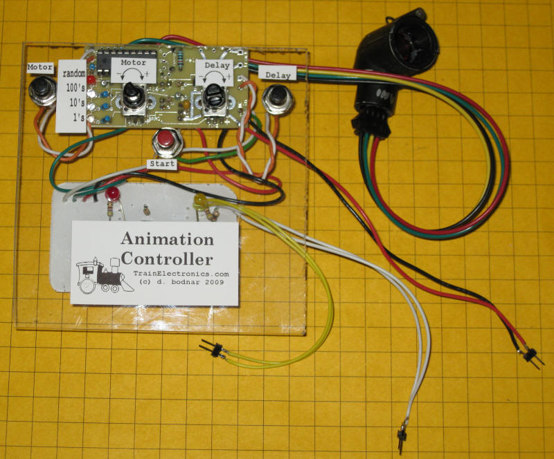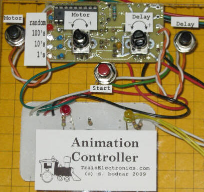 | Prototype The prototype is shown below. The three relays are at the bottom under the Animation Controller label. The main circuit board is at the top. There are two potentiometers that are used for setting motor run and delay times. The two push button switches to the left and right are used for initial setup and testing. The yellow wires connect to the motor and the white ones to its separate power source. The red/black wires go to a 12 volt DC power source for the circuit. The IR sensor is in the upper right. The START button starts the motor just as the sensor does. Note that the sensor must be plugged in to operate.
