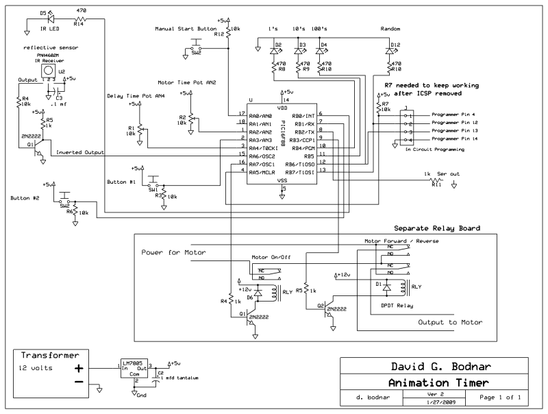 | Design To expedite development of this project the timer will be based on an existing circuit board that is being used for the BARC (Blinking Auto-Reverse Controller) The only major rewiring will be to add an Infrared detecting capability. The unit's relay and other control components will be replaced by three external SPDT relay that will be used to control the motor. In addition there are two pots that can be used to adjust the time. An array of 4 LEDs will be used to show timing and two push button switches will be used during setup. |