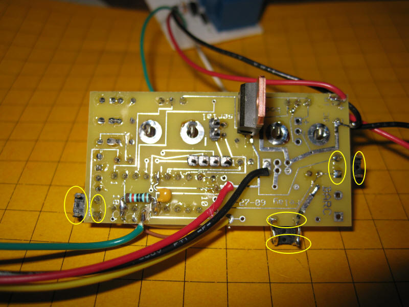 To attach external switches solder in parallel with the switches on the circuit board. In this view of the bottom of the circiut board the START switch is on the bottom edge towards the right, the MOTOR switch is bottom left and the DELAY switch is on the right edge. You can solder to the terminals on the board that are circled. The connections are close together so be sure there are no solder bridges. You can also solder to the unconnected pins (also circled) coming off of the switches.