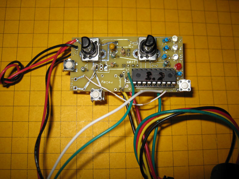 The three switches around the board are Motor, Delay and Start. External switches can be added in parallel with the small switches.