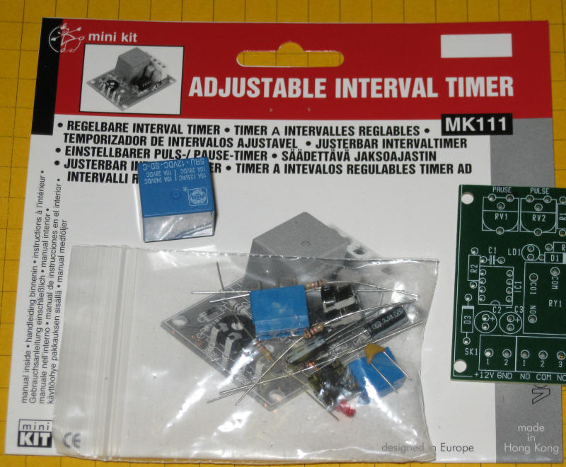 When power is applied to this circuit the relay closes and stays closed for 0.5 to 5 seconds. After that time expires the relay opens its contacts and pauses for between 2.5 and 60 seconds after which the cycle repeats. The board has two potentiometers on it (the round black items at the bottom of the circuit board). One sets the amount of time that the relay (the large blue object) stays closed and the other determines how long the circuit pauses before the relay closes again.