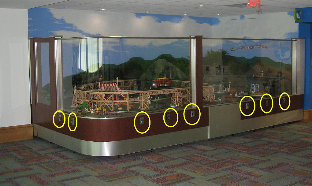 Timers are used in many different model railroad applications. When the Pittsburgh Garden Railway Society installed a model train layout at Pittsburgh's Children's Hospital we employed nearly a dozen separate timers. The layout includes a number of animations, sound effects, a train and a trolley. Each of these are individually controlled by one of the eight pushbutton switches that are found on the base of the platform (see yellow circles below).