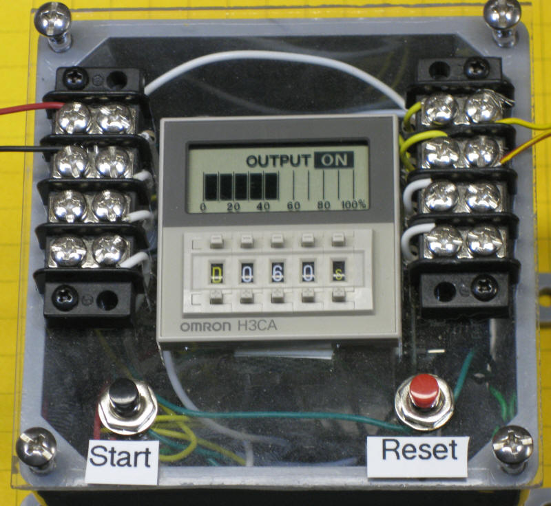 Here we see an H3CA that is in a box that has its connection terminals brought out to the top. The timer shows mode "D", which operates in almost the same manner as mode "C", and a time of "060" seconds. The timer is on and about 50% of the time has passed.