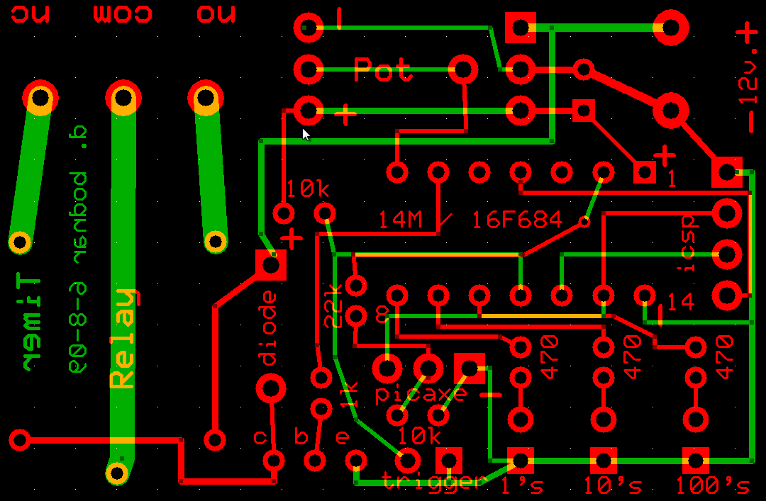 Here is a simple PICAXE program that will activate the relay whenever the switch is pressed and stay activated for a time period that is set by the pot. Even though there are two other LEDs in the circuit, D2 and D3, they are not used in this program. They will be used to give feedback on the operation of the circuit in the software modification shown next. As the comments indicate the time range is between 0 and 25.5 seconds. If the pot is turned so that its wiper is all the way to the side that is connected to ground it is set to 0 seconds, all the way to the 5 volt side is 25.5 seconds and centered it gives 12.575 seconds. Other times can be set by rotating it a bit more or a bit less. The maximum time range can easily be increased by changing the PAUSE 100 statement to PAUSE 1000. This would give a range of 0 seconds to 255 seconds. If PAUSE 10000 is chosen the range goes to 2550 seconds, about 42 minutes. The only disadvantage of using a higher pause time is that there are still only 255 increments between the minimum and maximum times.