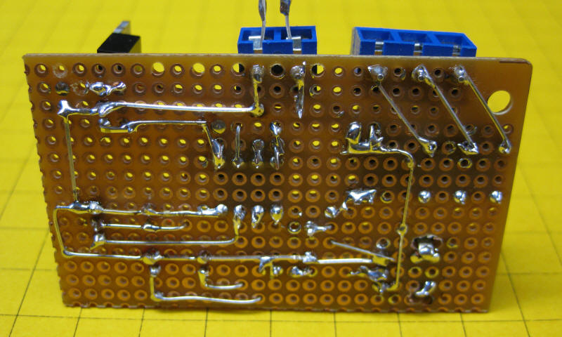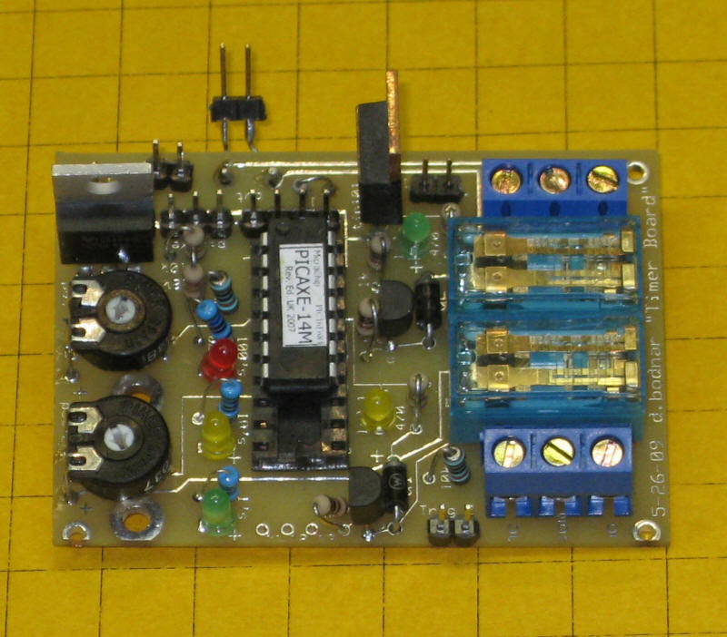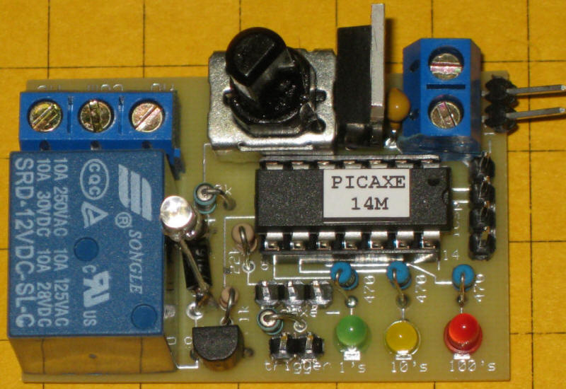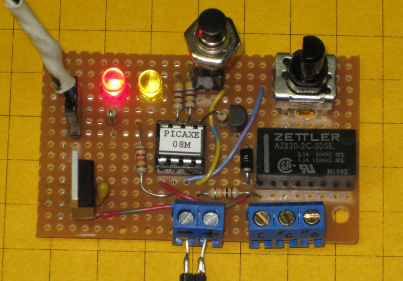 The circuit is shown here soldered to another type of prototyping board which has holes that are spaced the same as those on the breadboard. The potentiometer is in the upper right and is a larger unit than the first one. The trigger switch is at top center. The two-terminal connecting block at the bottom is for power (7-20 volts DC) and the three-terminal block to its right gives access to the relay's common, normally closed and normally open contacts. The cable at the upper left is for programming the PICAXE.