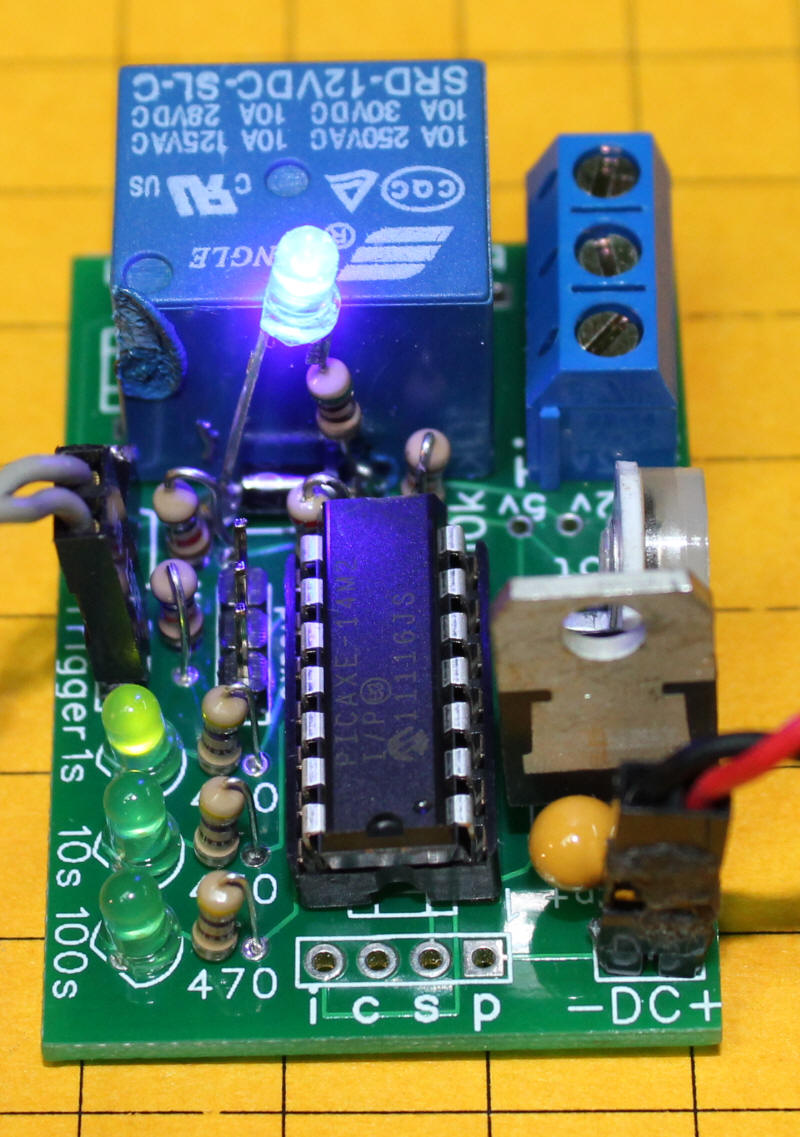 When the time has passed the relay opens and the unit waits for the trigger switch to be closed again.