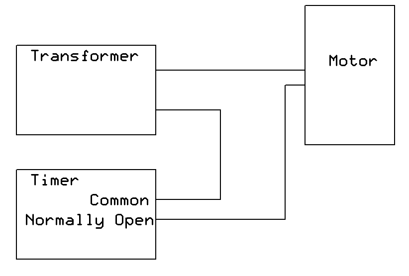 All that was required to complete the animation was to wire the motor to a 12 volt power supply with one of the wires going through the timer's "normally open" and "common" relay contacts. One of the buttons on the front of the layout was connected as the trigger. When a child presses the button the motor starts and runs until the set time expires.