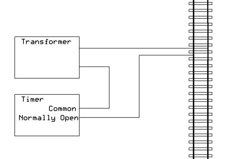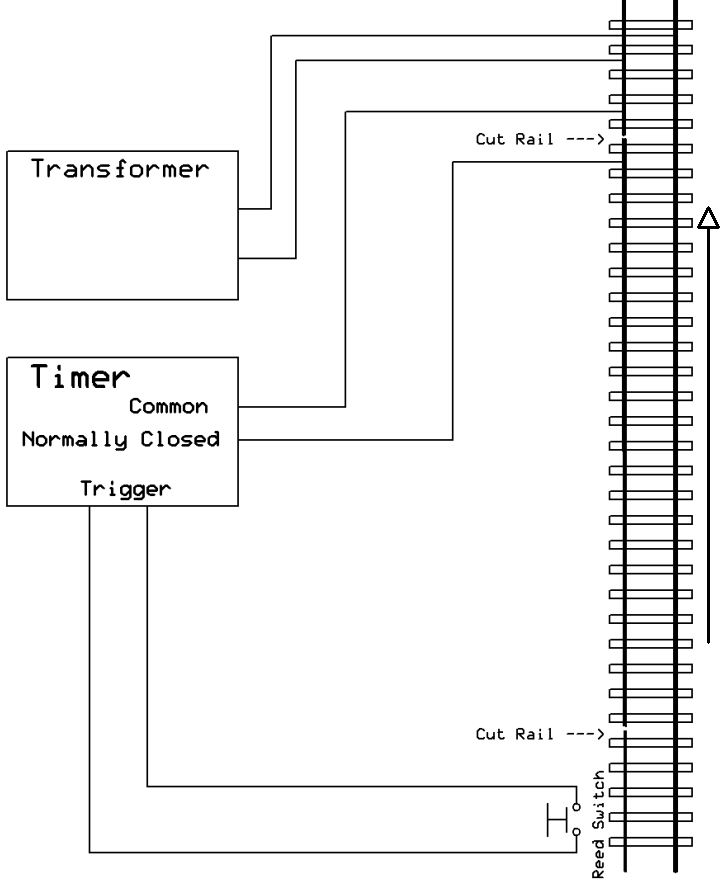 When the engine passes over the reed switch the timer is activated and the section of track is disconnected from power. When the time expires power is restored and the train continues on its way. Notice that we are using the "Normally Closed" contact on the timer board.