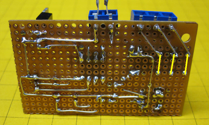 The second circled in the photo above is where the PICAXE programming cable is connected. The black (ground) lead from the programmer goes to the pin on the right, marked with an arrow in the photo below.