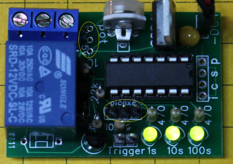 And the completed board using the latest circuit board (dated 10-31-2011) and the newer 14M2 PICAXE chip. Note the two circled areas in the photo. The upper area is labeled "12v" and "5v" - the board is set up for a 12 volt relay. If you are using one nothing needs to be changed. If you use a 5 volt relay cut the trace on the bottom of the board between the 12v hole and the center hole and put a jumper between the center hold and the 5v hole.