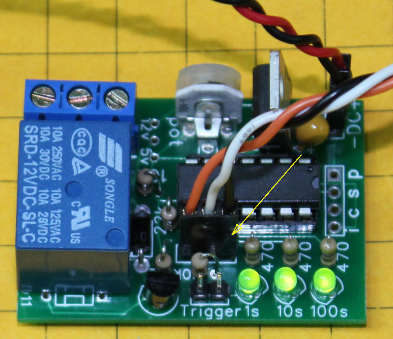The board will accommodate either the PICAXE 08M that was shown earlier or the PICAXE 14M. The 14M is almost identical to the 08M in its capability and price but has six additional pins (14 pins rather than the 08M's 8 pins) that we can use to make a more capable timer.