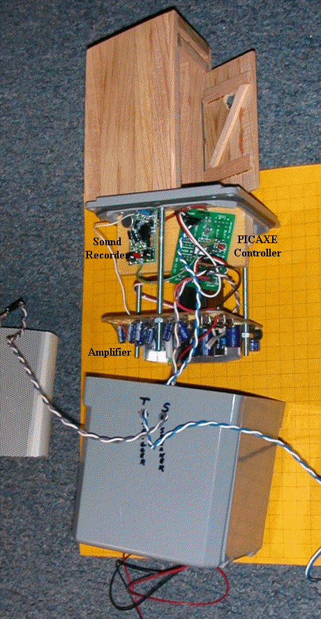 The PICAXE circuit board, on the right, and the sound card, on the left, are mounted high and (hopefully) dry at the top of the unit. Notice that the board used here is not one of the custom boards shown above since this animation was made before the new boards were designed.