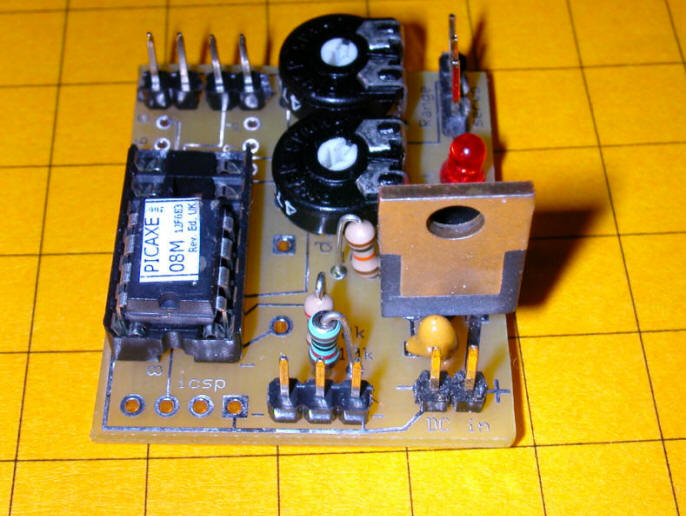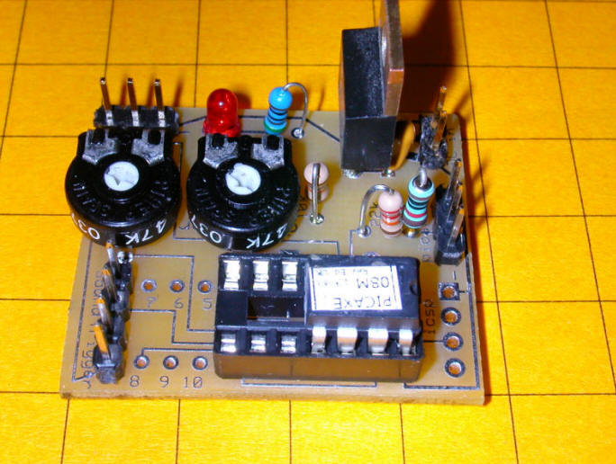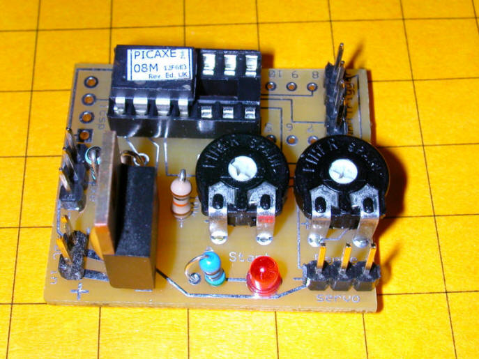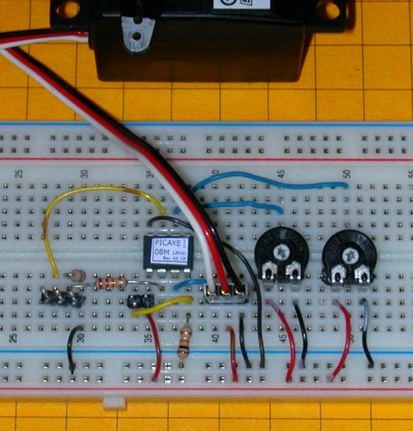 The prototype board below has the two potentiometers added to the right of the PICAXE. The pot on the left sets the counter clockwise starting position. The other pot sets the range of motion.