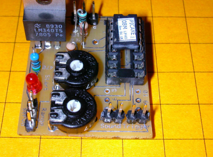 The sound board connects to the pins labeled "Sound". You can also connect an LED, with appropriate current limiting resistor, to the "Sound" pins. The "Trigger" connects to a switch is located in the lower right. The 7805 voltage regulator is clearly visible in the upper left.