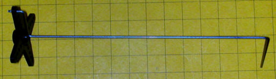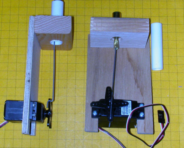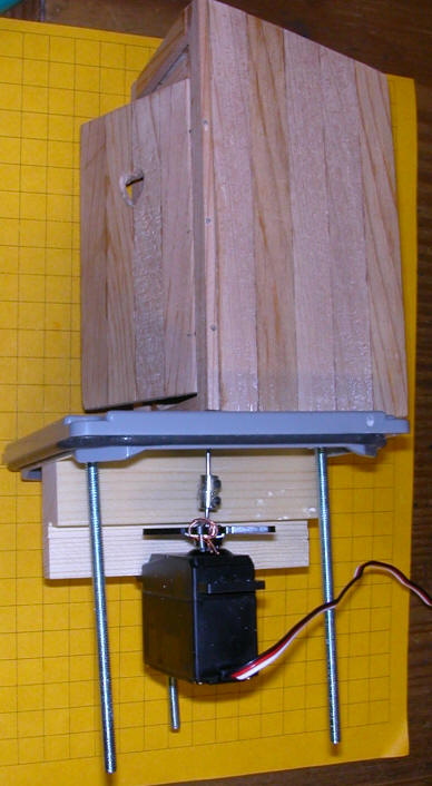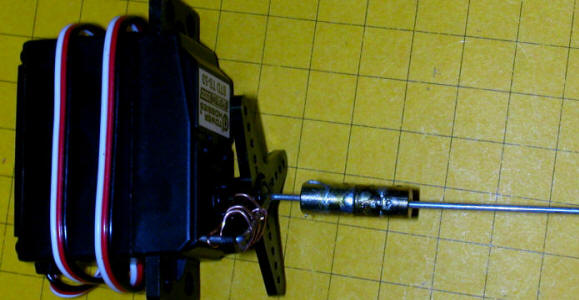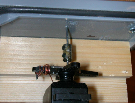 The coupler makes removing the servo and/or outhouse a simple task. The piece of piano wire at the bottom is connected to the servo's horn with wire and is centered on the servo's shaft.