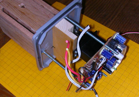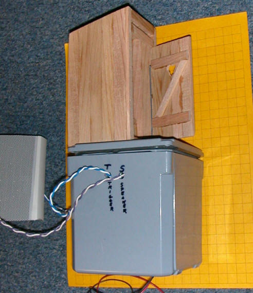 The box, a 4" x 4" x 4" electrical box from Lowes, is waterproof and houses the servo, PICAXE board, sound board and an amplifier from an old PC speaker system