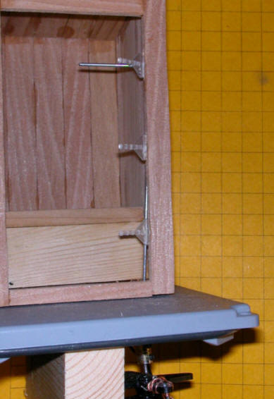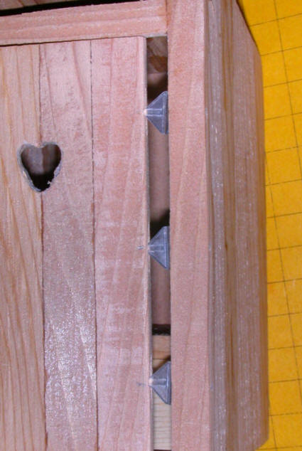 This close up view shows the model airplane hinges that are used to join the outhouse and the door. The rod that connects to the servo can be seen behind the top hinge.