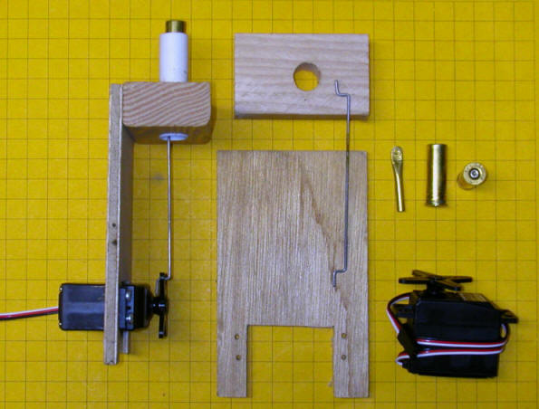 The unit on the left is complete. It will be mounted under the lid of a box whose top is flush with the terrain on the layout so that only the small tube shows above ground. A carved and painted prairie dog is placed into the brass tube that is moved up and down by the servo.